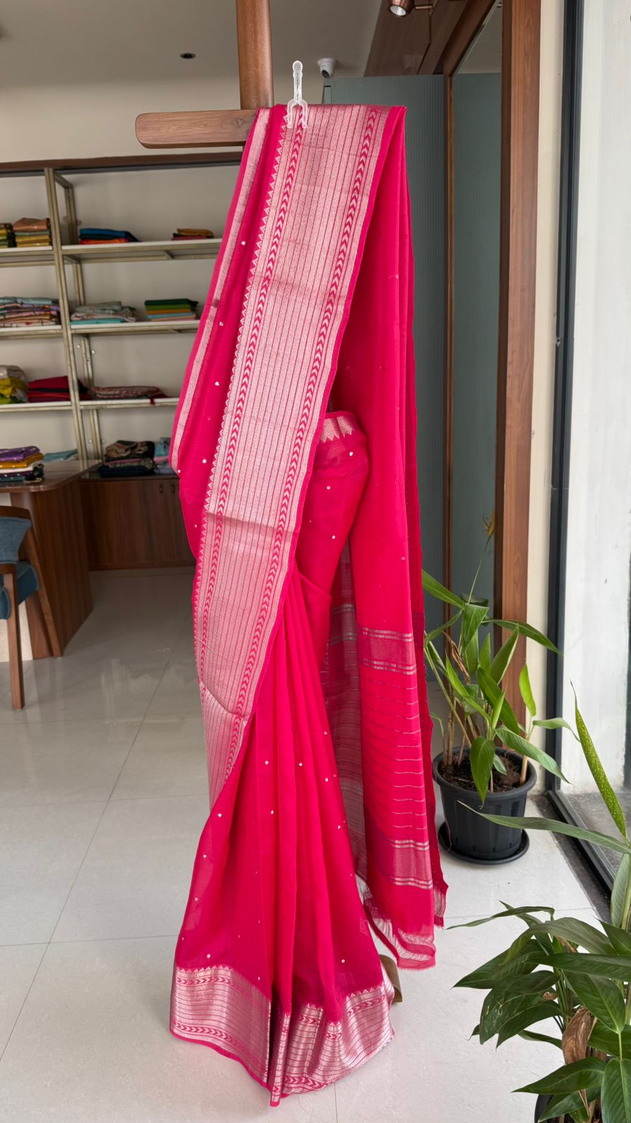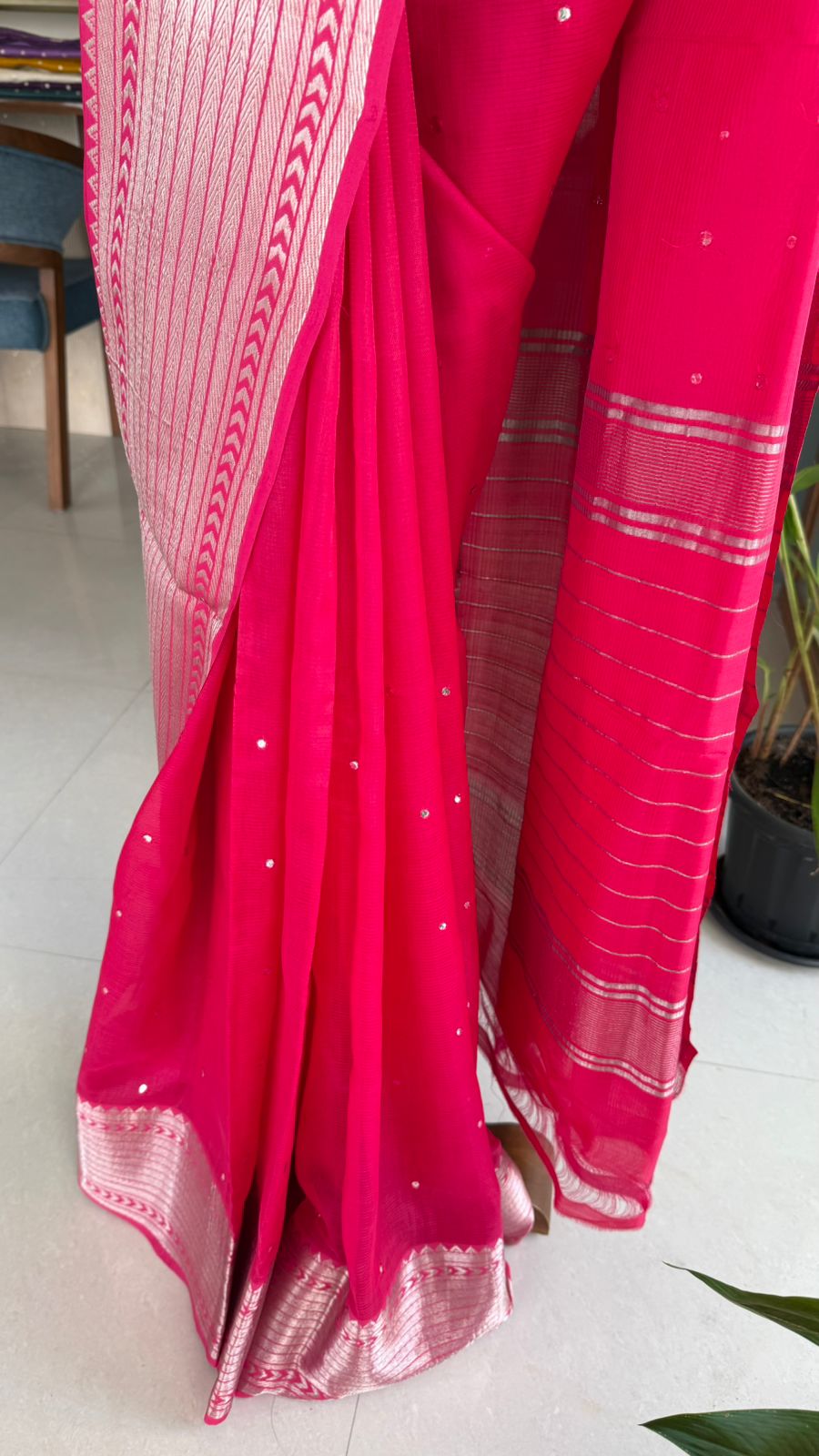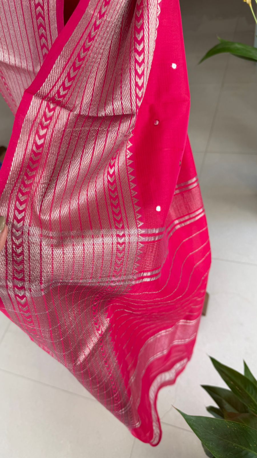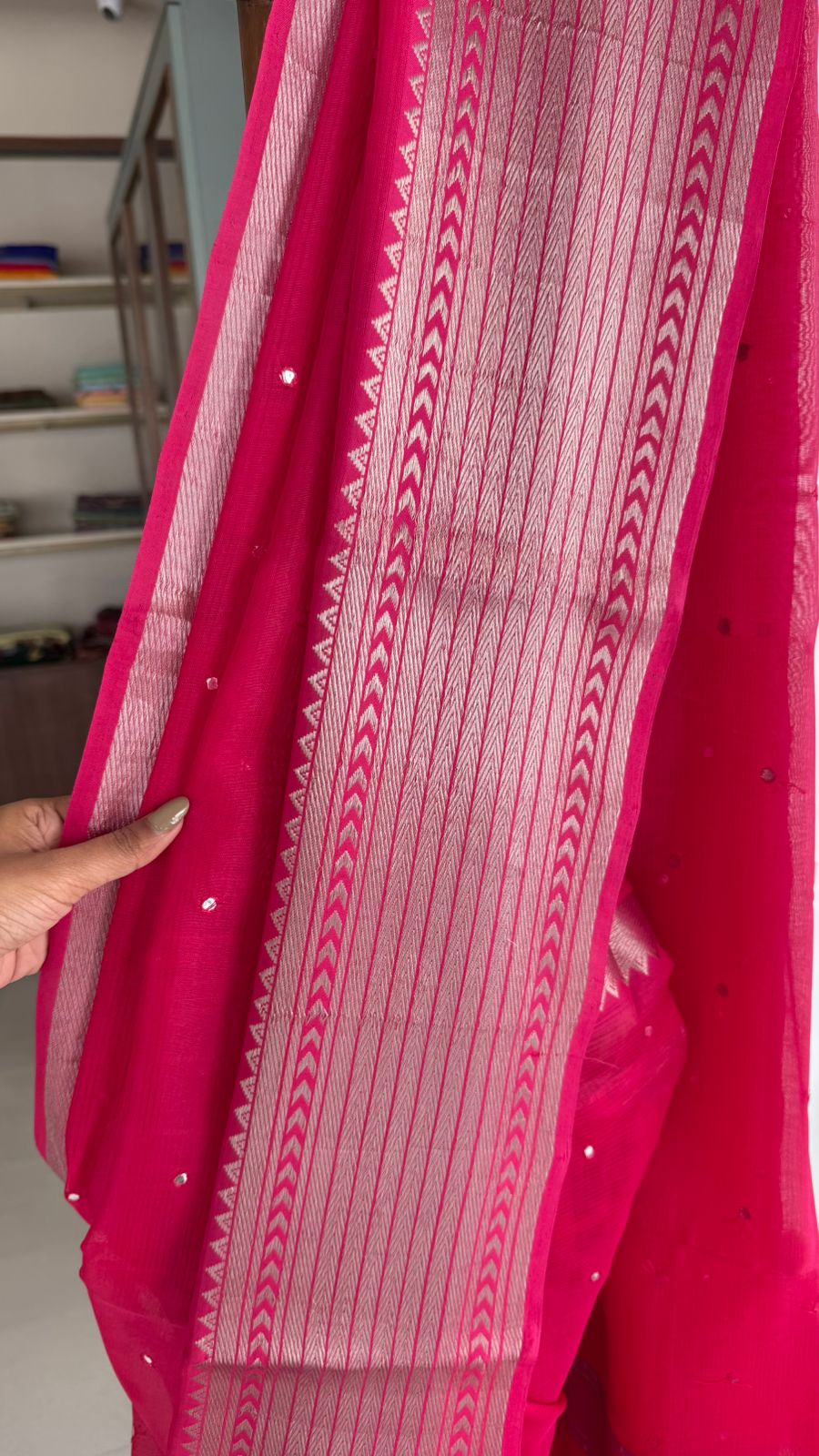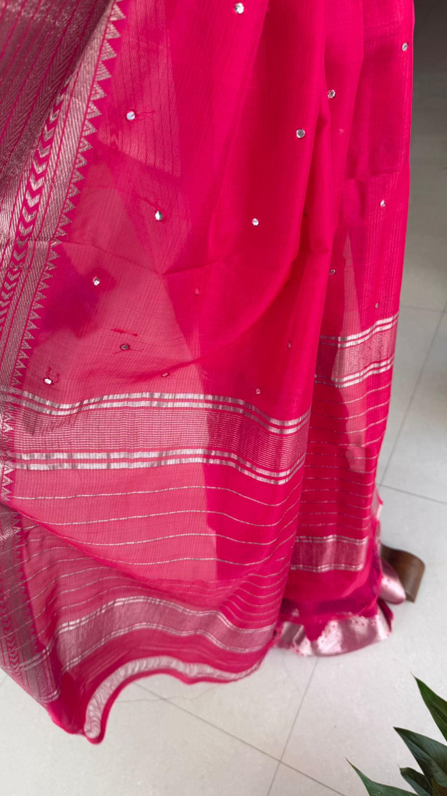 Fabric: Mangalgiri pattu with silver zari border and mirrors