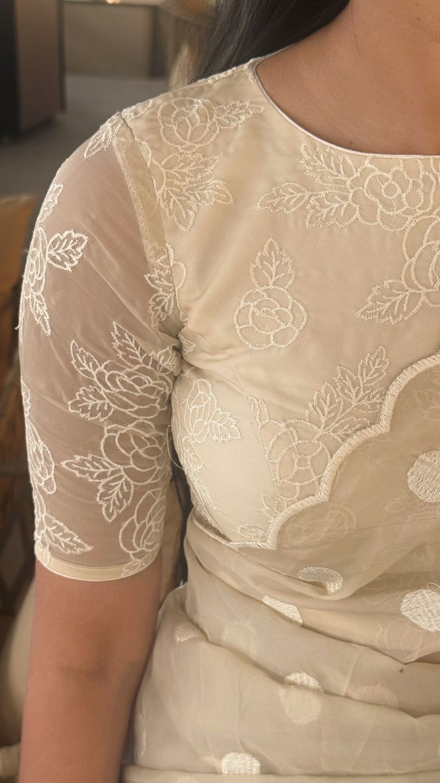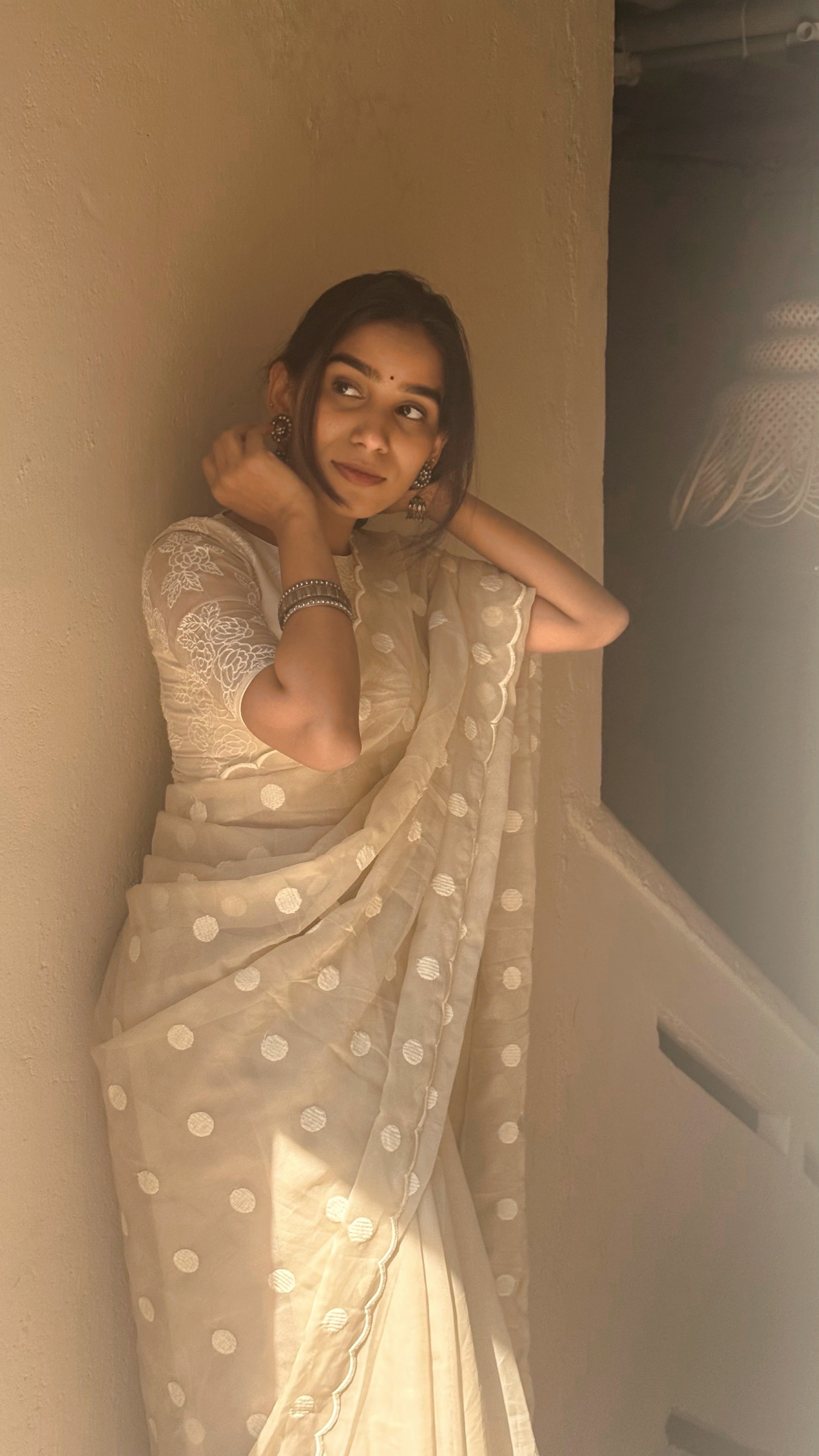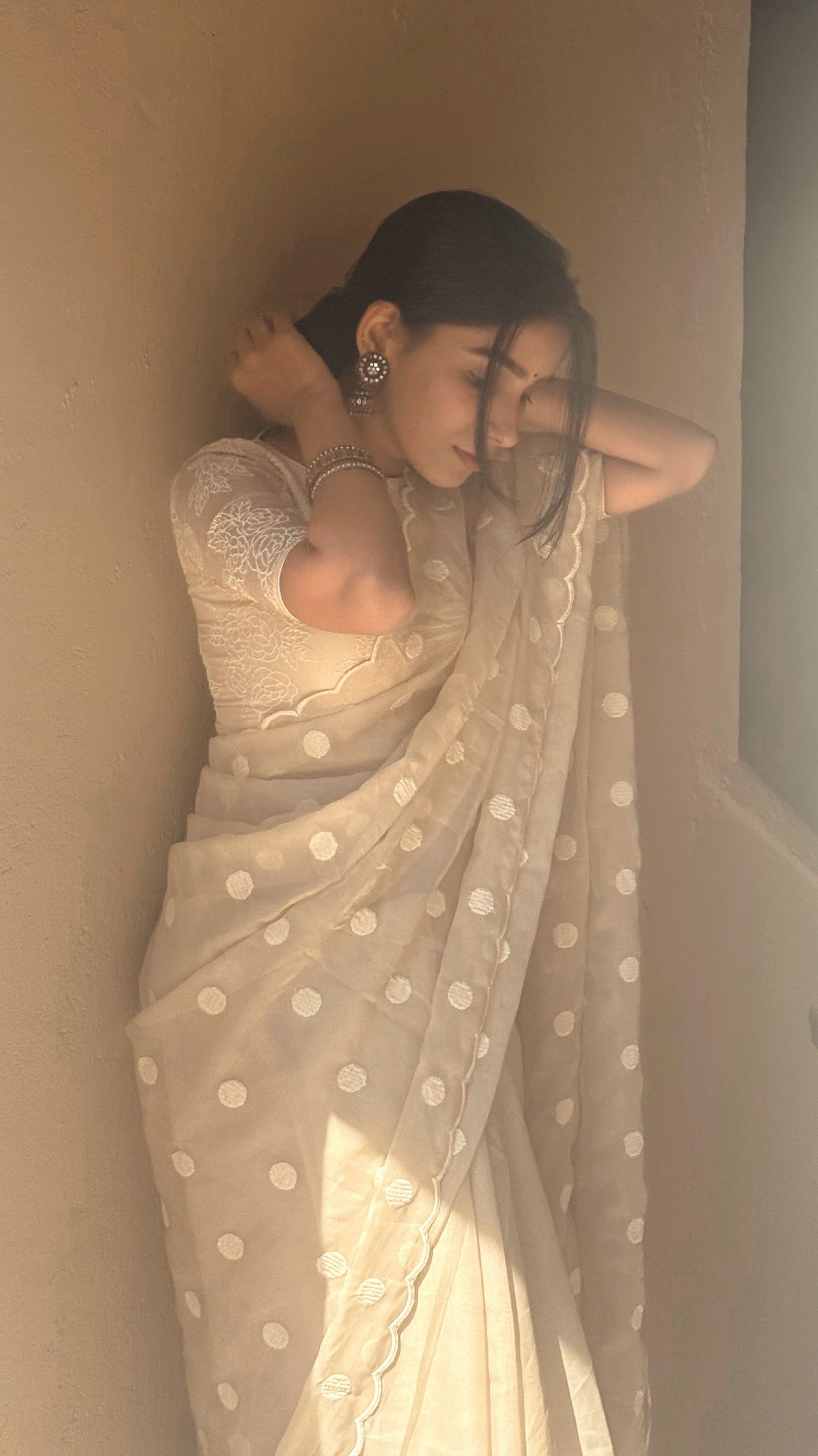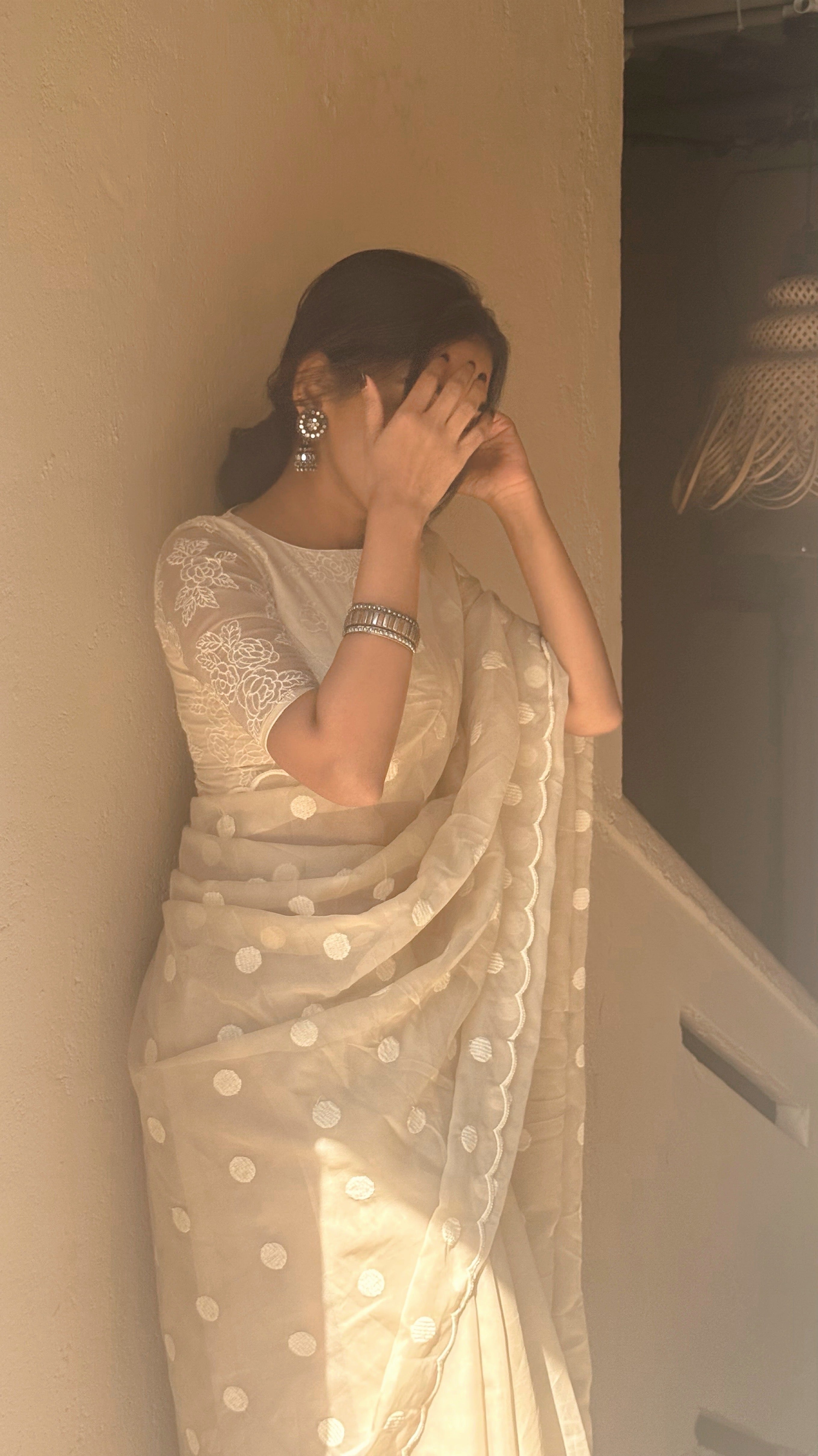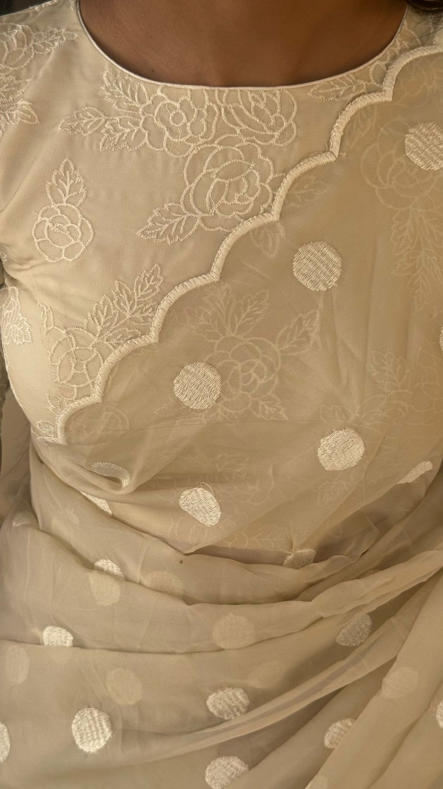 Fabric : Tabby georgette with embroidery polka dots with scallop border